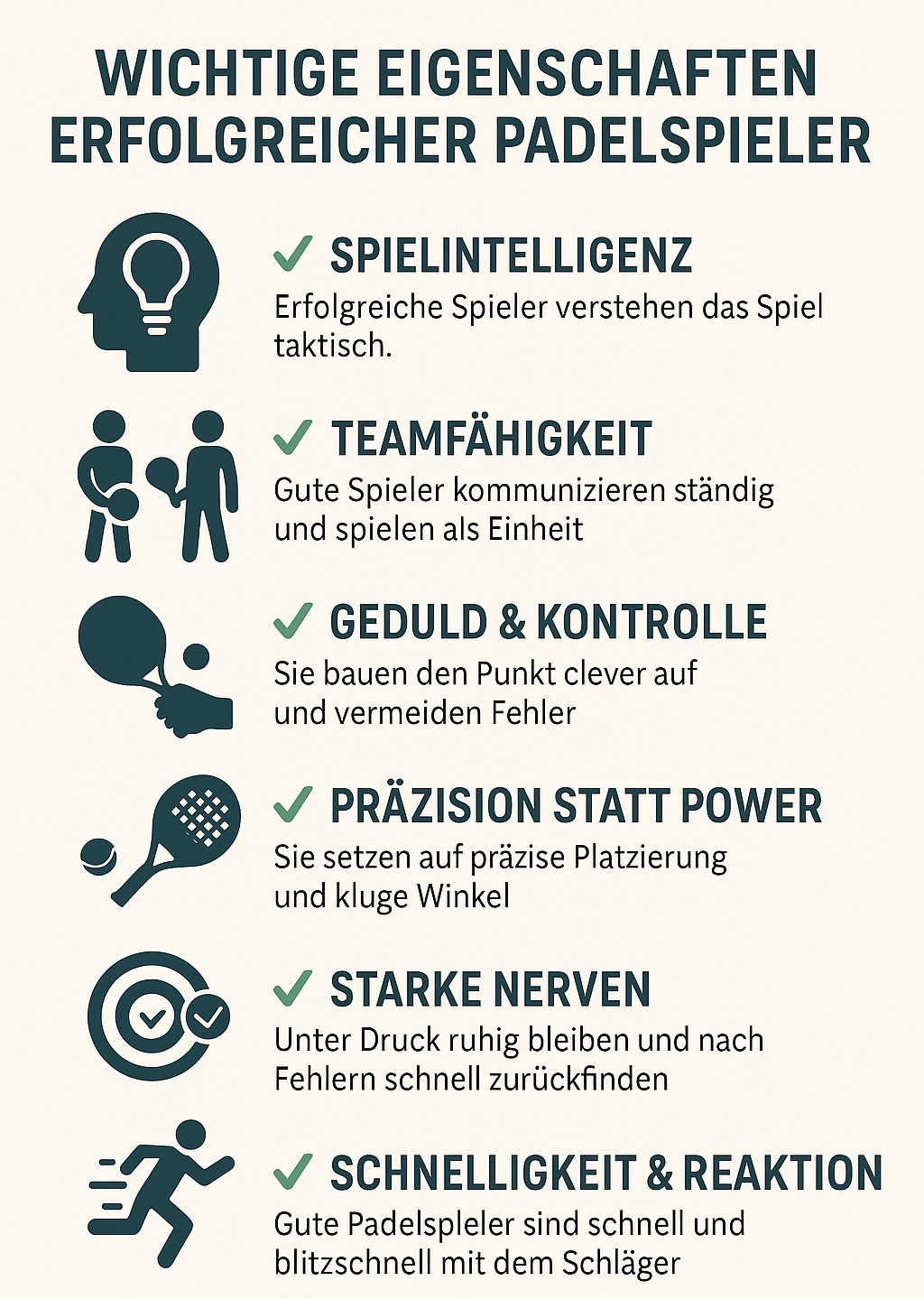 Erfolgreiche Padel-Spieler haben eine gute Spielintelligenz. Sie wissen, wann sie angreifen, wann sie abwarten und wie sie das gegnerische Team lesen können. Erfolgreiche Padelspieler kommunizieren ständig, unterstützen sich gegenseitig und spielen als Einheit, nicht als Einzelkämpfer. Statt wild anzugreifen und den Punkt überhastet zu erzwingen, bauen erfolgreiche Padelspieler den Punkt clever auf und warten auf die richtige Gelegenheit. Fehlervermeidung ist oft der Schlüssel. Viele Punkte kommen durch Fehler des Gegners. Gute Padelspieler haben starke Nerven. Sie finden nach Fehlern schnell zurück ins Spiel.